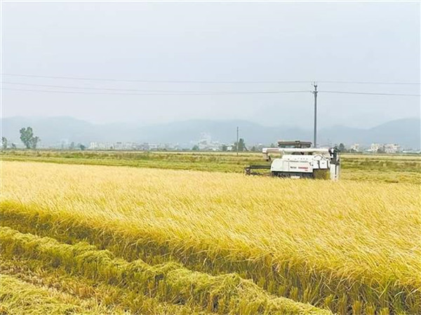测产现场,收割机在稻浪中穿梭作业。