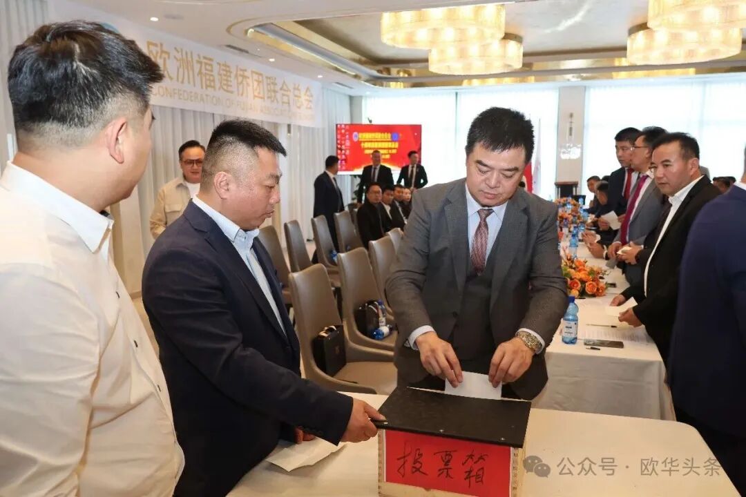 在公平、公正、公开的原则下,会议举行了欧洲福建侨团联合总会第四届轮值主席选举。现场设立监票人及计票人,全程监督与统计投票过程,确保选举公开透明、程序规范。共有31位主席亲临现场投票,另有3位主席通过委托书参与,共计34票。经无记名投票统计结果显示,胡建兵获以29票当选欧洲福建侨团联合总会第四届轮值主席。并经大会一致讨论决定,新一届换届庆典大会将于2025年12月中旬在福州隆重举行。