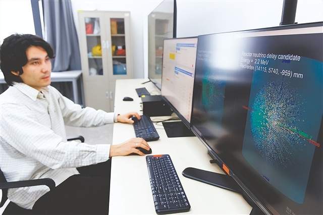 11月19日,科研人员在江门中微子实验运行控制室监测探测器运行情况。