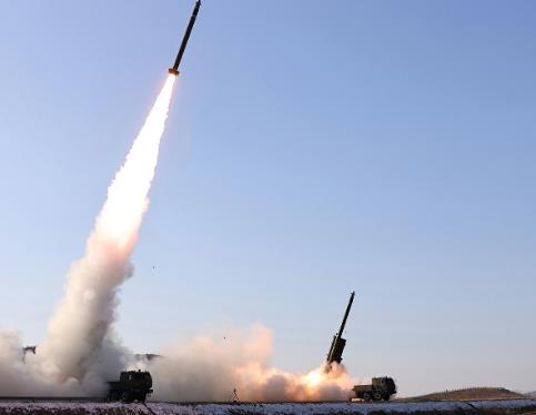 朝鲜导弹总局1月27日试射大口径火箭炮,以验证采用新技术的更新型大口径火箭炮武器系统的效力。发射的四枚火箭炮弹命中距离发射地点358.5公里的海上目标。 朝鲜劳动党总书记、国