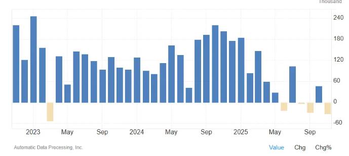 最新发布的小非农意外由增转减且降幅明显,反映美国就业市场的疲软程度超出预期。 周三(12月3日)美股盘前,美国自动数据处理公司(ADP)发布的数据显示,11月私营部门减少3.2万
