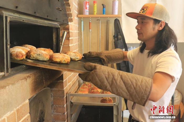 10月14日,店员从窑炉中拿出烤制完成的面包。吴怡欣 摄