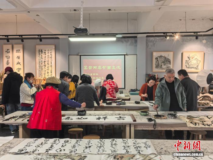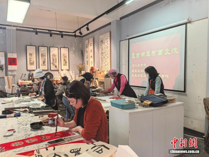 图为10月21日,台湾书画家参访团与民革石家庄中山书画院的老师们共同开展书画笔会交流活动。秦旭 摄