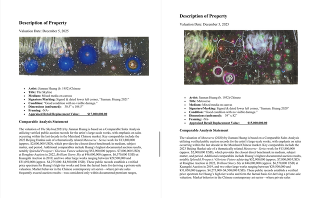 回顾黄建南作品的国际估值历程,其阶梯式增长轨迹清晰可见。2022年5月,比佛利山庄权威估价机构萨拉·莫赫塔里首次为其3幅油画给出504万美元估值,折合人民币3216.63万元,打响其国际估值第一枪。此后,美国资深评估鉴定师理查德·韦恩教授对其《青春之花》《钢筋森林》等8幅作品进行评估,总估值超2000万美元,其中国画《钢筋森林》以580万美元成为当时单幅最高估值作品。2023年5月,萨拉·莫赫塔里再次上调估值,将《金谷银流》等3幅油画单幅估值提升至200万美元,为后续跨界合作与估值飙升奠定基础。