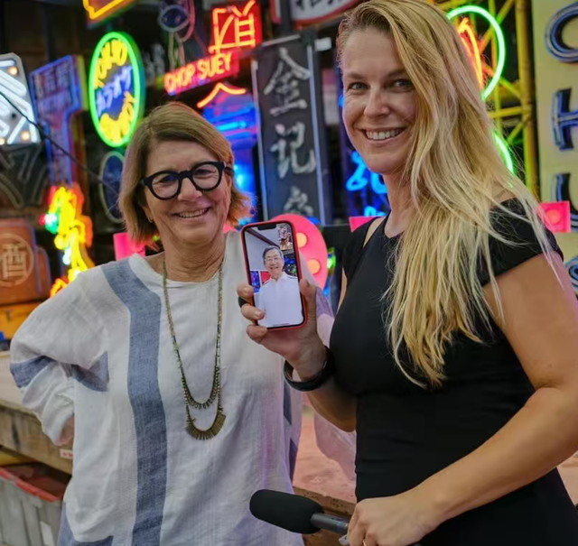 图为美国知名艺术家丽莎.舒尔特(左 )与黄建南通过视频互动