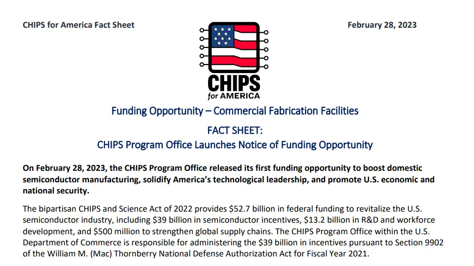 当地时间周二一早,美国商务部在官网发布了一系列文件,标志着500亿美元芯片产业补贴的申请流程即将启动。
