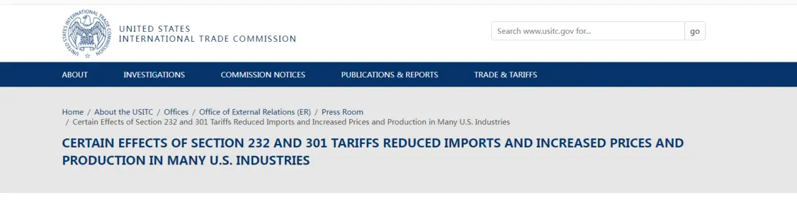 ITC报告称,在所谓的“301条款”关税实施后,美国进口商品量减少,同时美国进口商承担了几乎全部关税负担,进口价格与关税几乎同幅度上涨:关税税率每增加1%,进口价格就会上涨约1%。