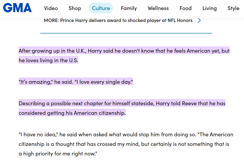 今年2月,在美国广播公司新闻网播出的晨间新闻节目《早安美国》上,哈里曾作为节目嘉宾被询问“在美国的下一步规划”。哈里当时称,他考虑过取得美国公民身份,但又补充道:“美国公民身份是我脑海中闪过的一个念头,但肯定不是现在最优先考虑的事情。”