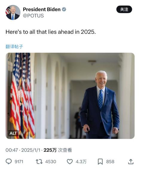 据美媒报道,当地时间1月1日,美国总统拜登在社交媒体发文称,“祝愿2025年一切顺利。”