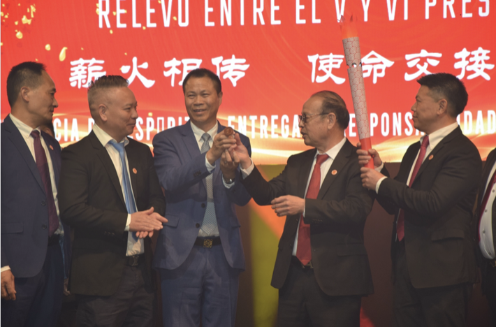 (图为第五届第六届新老会长传递火炬、交接会印 摄影/乔伊)