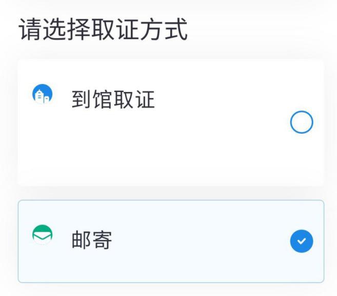 (三)选择取证方式。可选择“到馆取证”或“邮寄”。如选择邮寄发证,请提前准备清晰标注收件地址、付足邮资的回邮信封,随申请材料一并递交。