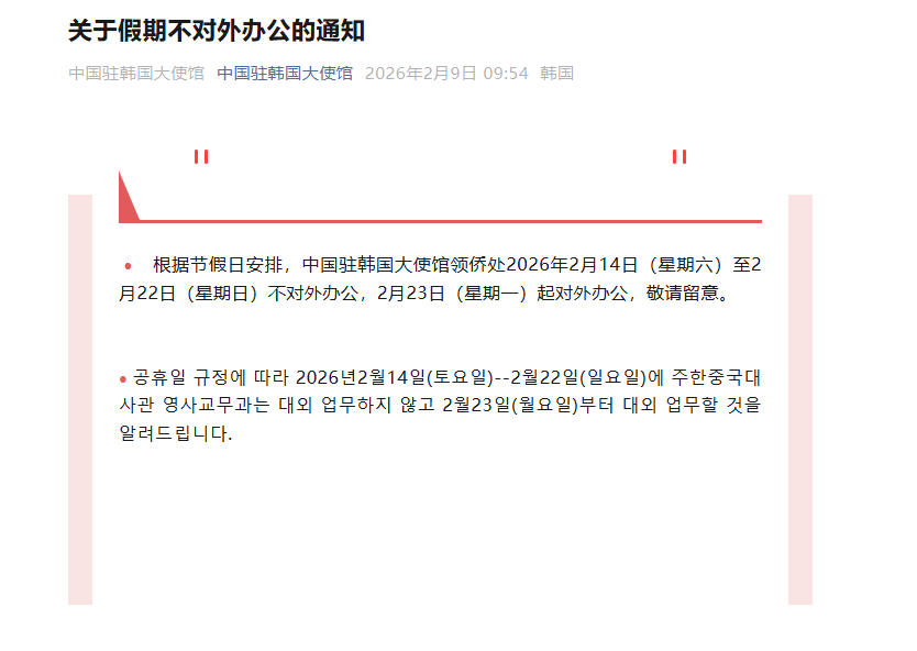 据“中国驻韩国大使馆”官方微信消息,根据节假日安排,中国驻韩国大使馆领侨处2026年2月14日(星期六)至2月22日(星期日)不对外办公,2月23日(星期一)起对外办公,敬请留意。