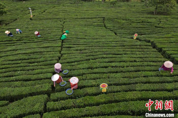 3月21日,广东柏塘万亩茶园里的茶农正在采摘春茶。中新社记者 陈楚红 摄