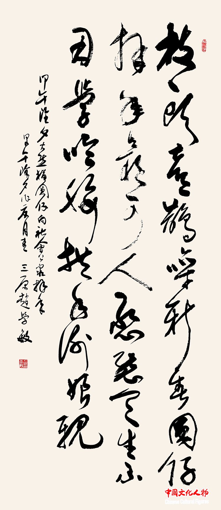 赵学敏先生系陕西三原人。作为于右任先生同乡后辈,他少时得于公秘书李楚材亲授,数十年深耕书艺,形成“碑骨帖韵”的独特风格——楷书取法《张猛龙》《郑文公》等北碑,笔力沉厚宽博;草书承于右任标准草书精髓,融合怀素、黄庭坚等诸家之长,达到“豪放而不失法度,自由而仍有归依”的艺术境界,正如书法评论家所言“学于而能化于,出入古今自成格调”。