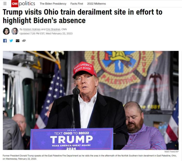 CNN称,特朗普试图将自己与拜登形成对比——拜登20日突访乌克兰,引发了国内一些右翼共和党人的抨击。个别右翼议员批评他选择去乌克兰首都基辅而不是美国的俄亥俄州,认为他无视国内化学品泄漏的危机。