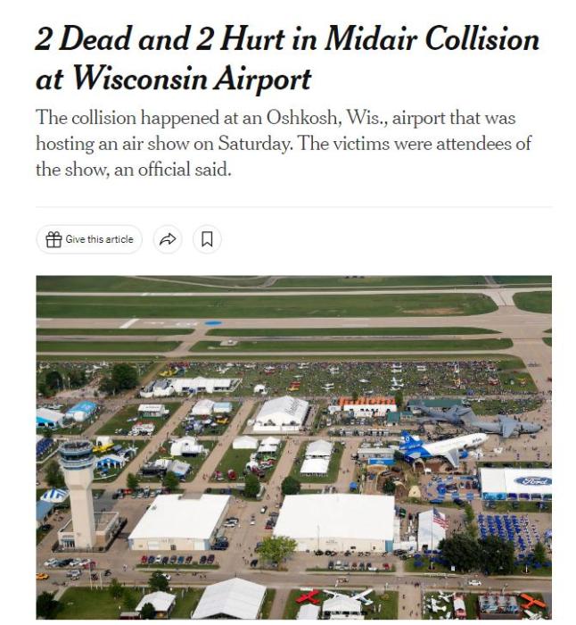 据《纽约时报》报道,美国联邦航空管理局(FAA)称,事故发生在威斯康星州奥什科什的惠特曼地区机场。在为期一周的活动中,“实验飞机协会”在此举办飞行表演和航展。