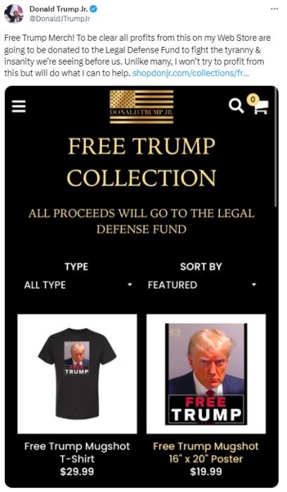 随后,特朗普将这张照片发布在社交媒体上,并附上了自己竞选网站的网址。25日,特朗普的长子小特朗普也开始在网店销售印有其父亲嫌犯大头照的商品。路透社称,特朗普这张打着红色领带、头发闪亮、神情严肃的照片被印在T恤、玻璃小酒杯、马克杯和海报上。