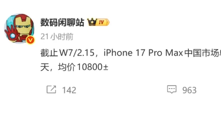 2月24日,数码博主@数码闲聊站 爆料称,截至2026年2月15日,iPhone 17 Pro Max在中国市场的单品激活销量已超1000万台,均价在10800元左右,解锁千万销量用时约150天。 这一数字也可与另一位