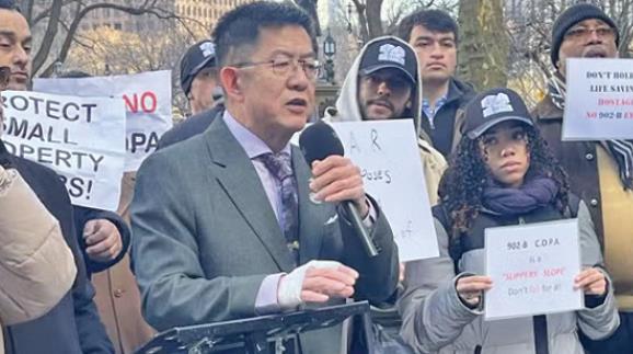 众多小业主18日(星期四)于市政厅外举行集会反对社区购房机会法案(COPA),州参议员陈学理(Steve Chan)现身表达支持。 陈学理表达了对该法案的强烈反对,我们买了房子,你却告诉我