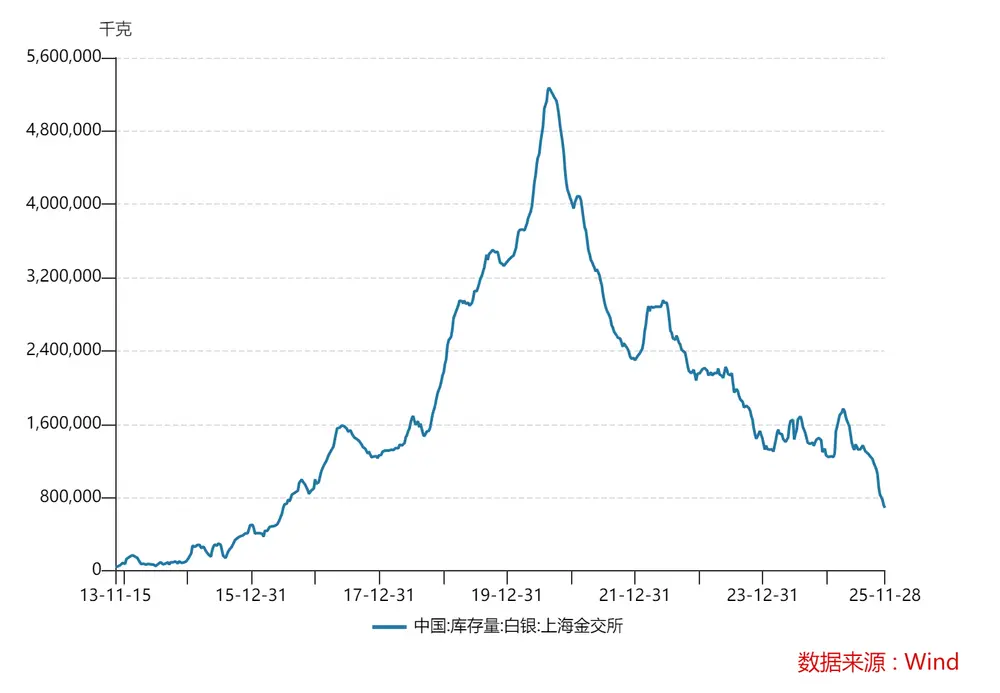 从全球数据来看,伦敦、纽约、上海等主要市场的库存均处在多年低位。Wind数据显示,11月28日,上海金交易所白银库存为687.195吨,跌至近10年以来最低水平;COMEX白银库存已经从9月底的高位1.654万吨降至上周三的1.42万吨,降幅约16.5%。