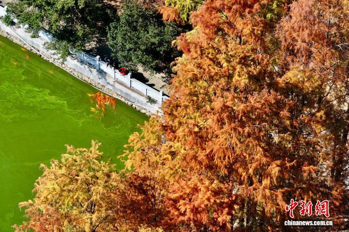 12月29日,空中俯瞰福州国家森林公园“换装”变红的水杉林。红透的水杉林如天然调色盘,绘就冬日别致风光。(无人机照片)中新社记者 王东明 摄