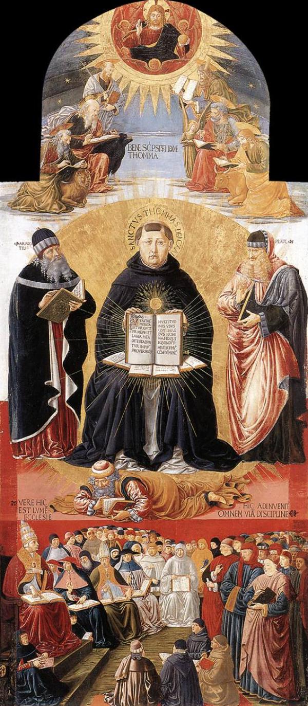 托马斯·阿奎那坐在柏拉图(右)和亚里士多德(左)当中,贝诺佐·戈佐利(Benozzo Gozzoli)绘《圣托马斯·阿奎那的胜利》( Triumph of St. Thomas Aquinas, 1471),巴黎卢浮宫藏。