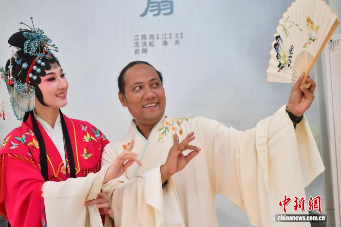 图为电影节海外嘉宾(右)观影后向福建省实验闽剧院的演员学习闽剧。中新社记者 张斌 摄