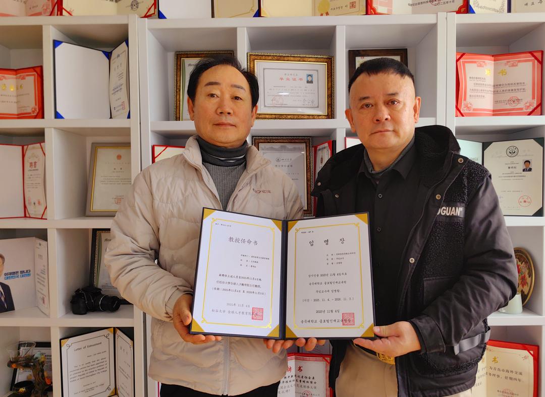 韩国松谷大学赵院桓院长(左)为曹明权博士(右)颁发松谷大学全球人才教育院主任教授聘书后共同合影留念