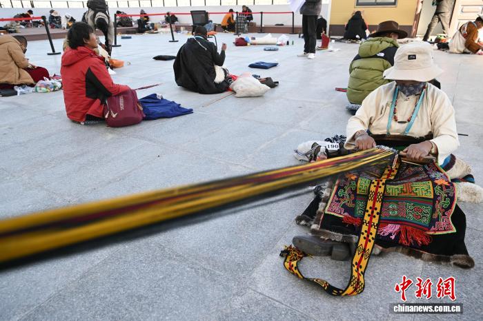 11月23日,第二届“工巧杯”西藏工艺美术中青年高技能人才技艺大赛现场实操技能在拉萨市唐卡艺术博物馆开赛。本次大赛以“薪火相传 守正创新”为主题,由284名选手来自西藏6(市)地的42个县(区),涵盖唐卡、雕塑、编织等36类工艺。据悉,西藏工艺美术行业现有2700余家市场主体、3.7万余名从业者,2024年产值超30亿元(人民币)。图为参赛选手在手工编织腰带。中新社记者 贡嘎来松 摄