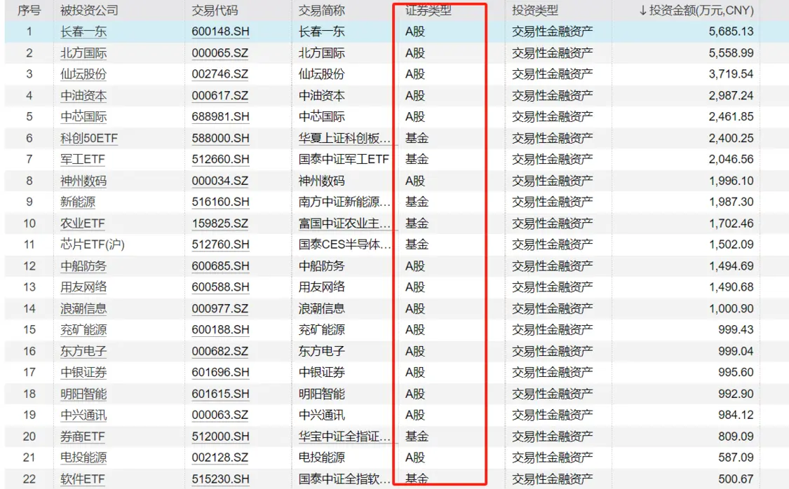 上市公司的证券投资收益是年报季最受关注的焦点。Wind数据显示,已发布的2023年年报中,309家上市公司披露了证券投资信息,有8家公司持有A股股票超过10只,包括中国铁建、中国交建(601800.SH)、安德利(605198.SH)、中国中铁(601390.SH)、大众公用、长源东谷等。但整体来看,购买债券、货币型基金是上市公司去年证券投资的主要方向,有个别公司拿出数亿资金炒股。