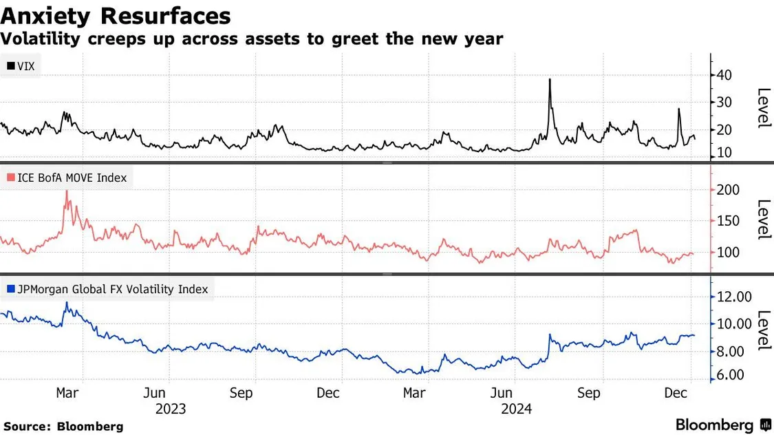虽然上周五美国市场情绪高涨,但在圣诞节后的大部分时间里,各类资产的交易员们都在抑制2024年大部分日子里主导市场的强劲风险偏好——美债和企业信贷资产的波动率悄然上升;股票市场则遭遇了有史以来最严重的年末跌幅之一;那些全球投机者眼中的宠儿——追踪比特币的现货ETF也经历了有史以来最严重的资金外流……