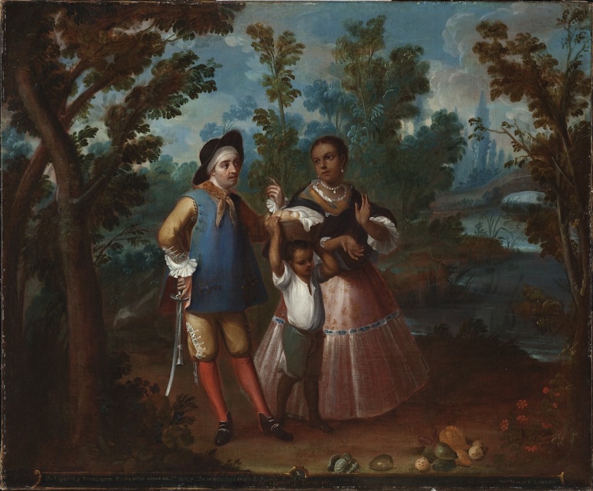 画家不详, 《阿比诺人与西班牙人创造尼格罗Tornatrás人》(De Albina y Español Produce Negro Torna Atrás) , 1770-1780年,墨西哥国家银行(Banco Nacional de Mexico)藏, 墨西哥城