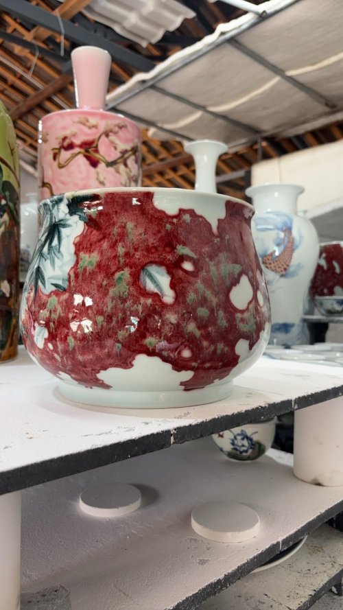鼎福窑位于江西省景德镇市珠山区新厂街道黄泥头三步园,周围环境清静。鼎福窑的一楼大厅是师傅拉坯与修坯的地方,进门的两排木货架上陈列着师傅们做好的各式各样的手工花瓶和器皿,来画瓷的艺术家可以选择自己喜欢的造型来创作。