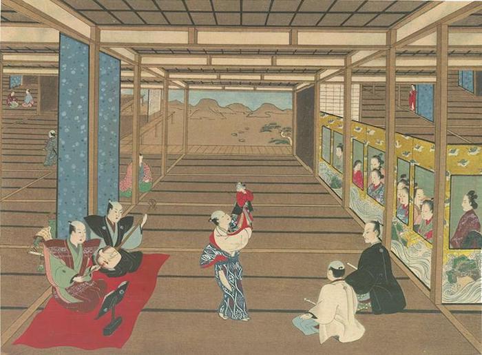 我们获得了《殿中傀儡戏图》(图八十五),以便展示清倍在人物面容刻画上的一大特色,并且将其作为借鉴当时西洋画的透视法(偶尔有错误)而流行一时的所谓“浮绘”的一个例子。